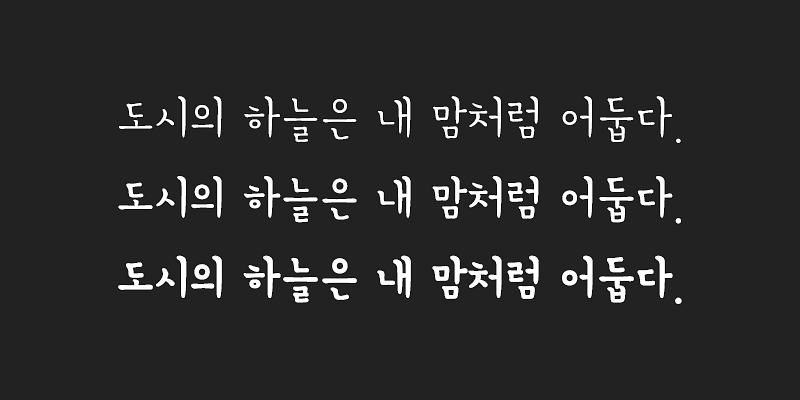 210 Byulbitcha is designed based on a style of calligraphy called Gung-che, used by the court ladies during the Joseon dynasty in Korea. This font is a modern interpretation, modified from the original vertical writing direction to be suitable for horizontal typesetting. Unlike the formal look of the original Gung-che, 210 Byulbitcha has a more casual feel that features soft curves and serifs, giving it a calm and refined look.