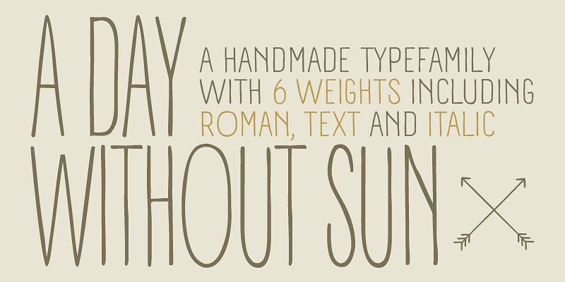 A Day Without Sun is an ultra-condensed version of Panforte, created by Cosimo Lorenzo Pancini on the original design by Debora Manetti. Hand drawn in easy big strokes, it’s an extremely condensed typeface that allows you to typeset text in faux-handmade fashion, with the subtle elegance of vintage hand lettered menus. Lovers of world cuisine will be delighted to discover that this typeface supports over forty languages using the latin alphabet, spiced with hand-picked diacritics and it also comes with a tasty side dish of greek and cyrillic glyphs. Its grungy, handmade details are visible at medium and high point sizes but do not impact the effect of the font when set in text. A Day Without Sun OpenType features include small case characters, oldstyle numerals and a series of ligatures that help keep the distinctive handmade look (they can be switched off by unchecking the “standard ligatures” option in your design software).