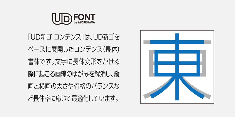 A condensed typeface is useful when packing a lot of information into a limited amount of space without compromising legibility and readability. Thanks to its design versatility, it is useful not only for food product ingredient information, instructions on packages, leaflets, book’s bellyband, and web banners, but also for giving an accent to headlines, taglines, and body text. UD Shin Go Condensed is developed based on the UD Shin Go sans serif type as a solution to the problem of stroke distortions resulting from horizontal scaling. The weights of the vertical and horizontal strokes and the structural balance are optimized to effectively display more information even in a limited space.