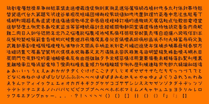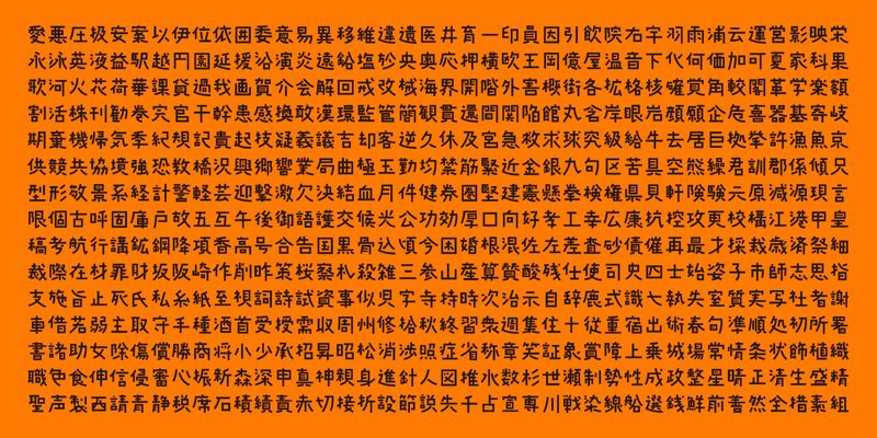 This font includes top 1,000 kanji characters chosen from character frequency tables made by newspaper companies, publishing houses and linguistic research institutes, plus 206 kana characters and punctuation marks.