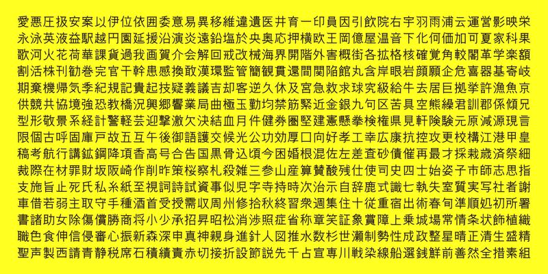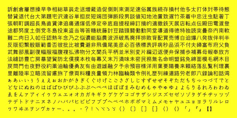 This font includes top 1,000 kanji characters chosen from character frequency tables made by newspaper companies, publishing houses and linguistic research institutes, plus 206 kana characters and punctuation marks.