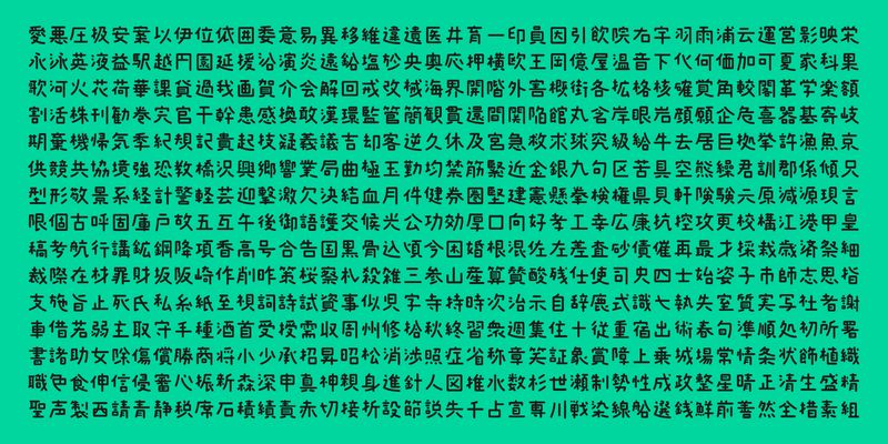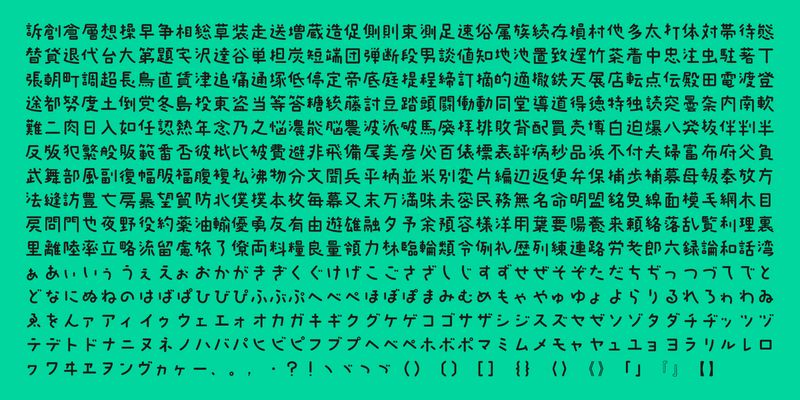 This font includes top 1,000 kanji characters chosen from character frequency tables made by newspaper companies, publishing houses and linguistic research institutes, plus 206 kana characters and punctuation marks.