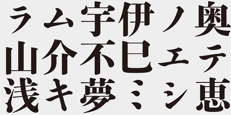 Ajimin has the flavor of hot metal type and, like Bodoni, its vertical strokes are clear and heavy and its horizontal strokes are precise and thin. Its elements possess strength and stability. Ajimin is a unique Mincho-style display typeface. Ajimin Modern’s elements are more sharply designed, but that sharpness is balanced by the richness and elegance of the design. Ajimin’s biggest feature is its 10 kana variations, ranging from running-hand-like designs, to revivals of designs from the age of hot metal type, to modern style kana. These variations make Ajimin useful for a wide range of purposes.