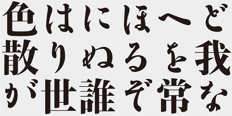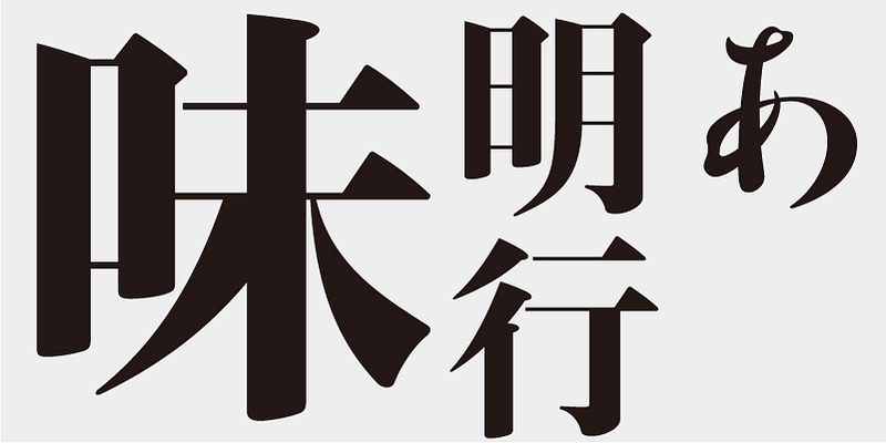 Ajimin has the flavor of hot metal type and, like Bodoni, its vertical strokes are clear and heavy and its horizontal strokes are precise and thin. Its elements possess strength and stability. Ajimin is a unique Mincho-style display typeface. Ajimin Modern’s elements are more sharply designed, but that sharpness is balanced by the richness and elegance of the design. Ajimin’s biggest feature is its 10 kana variations, ranging from running-hand-like designs, to revivals of designs from the age of hot metal type, to modern style kana. These variations make Ajimin useful for a wide range of purposes.