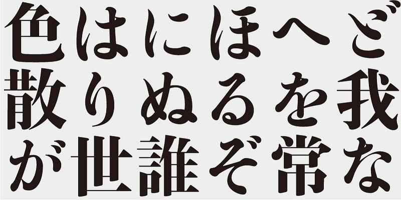 Ajimin has the flavor of hot metal type and, like Bodoni, its vertical strokes are clear and heavy and its horizontal strokes are precise and thin. Its elements possess strength and stability. Ajimin is a unique Mincho-style display typeface. Ajimin Modern’s elements are more sharply designed, but that sharpness is balanced by the richness and elegance of the design. Ajimin’s biggest feature is its 10 kana variations, ranging from running-hand-like designs, to revivals of designs from the age of hot metal type, to modern style kana. These variations make Ajimin useful for a wide range of purposes.