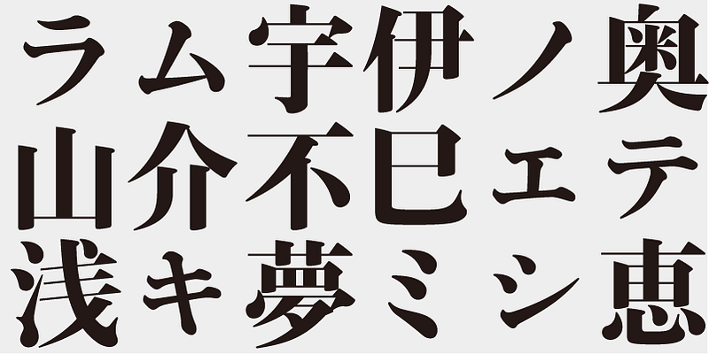 Ajimin has the flavor of hot metal type and, like Bodoni, its vertical strokes are clear and heavy and its horizontal strokes are precise and thin. Its elements possess strength and stability. Ajimin is a unique Mincho-style display typeface. Ajimin Modern’s elements are more sharply designed, but that sharpness is balanced by the richness and elegance of the design. Ajimin’s biggest feature is its 10 kana variations, ranging from running-hand-like designs, to revivals of designs from the age of hot metal type, to modern style kana. These variations make Ajimin useful for a wide range of purposes.