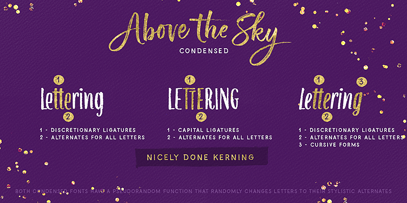 Please welcome a new brush written font family Above the Sky which also includes a long requested all-caps marker font, the one you can use to add a “secondary” text to your designs. All fonts make good companions and can be used for all sorts of type-based creations, quotes, branding, merchandise, packaging, invites, greeting cards and so on. You will be over the moon when you find out all Above the Sky possibilities. The brush script has tons and tons of alternates, ligatures, swashes - more than 1200 glyphs are here to serve you well. It can be successfully combined with the Condensed font or/and with the Marker font!