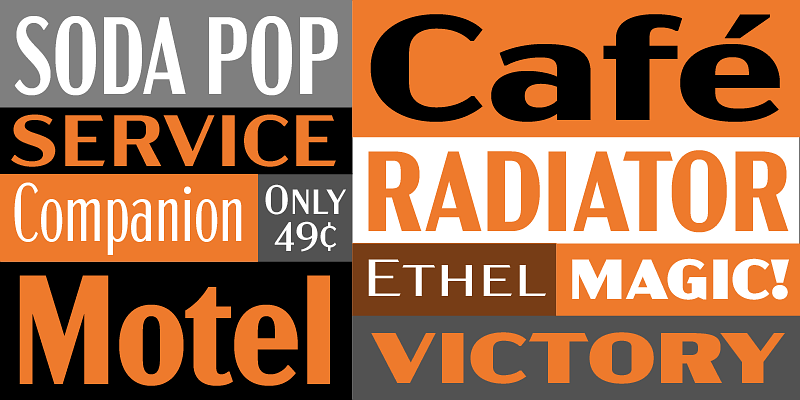 Acme Gothic (2018) is based on the thick-and-thin gothic lettering style popular in the U.S. in the first half of the twentieth century. There have been typefaces in this genre before, but they were either too quirky (Globe Gothic), too English (Britannic), too Art Deco (Koloss), too modern (Radiant), or too Art Nouveau (Panache). None captures the plain, workman-like, vernacular style of Acme Gothic. There are five widths (Compressed, Condensed, normal, Wide, and Extrawide) each with five weights (Light, Regular, Semibold, Bold, and Black) for a total of 25 different styles.