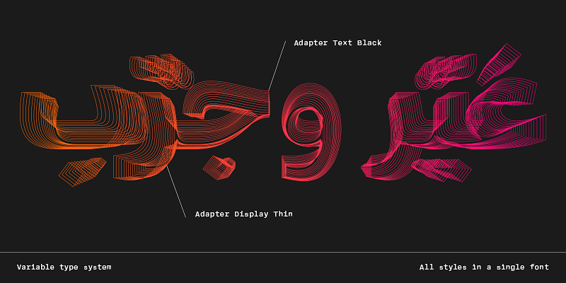 A universal monolinear typeface with contemporary aesthetics. Two size-specific variants, Text and Display, are coupled into a type system that packs a wide range of weights and uniwidth italics into a single variable font.