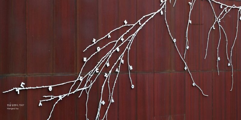 11,172 Hangeul letters. Each character is composed of geometric forms, such as horizontal, vertical, diagonal line and perfect circles. Long stems of vowel extended to meet the center of final consonants.