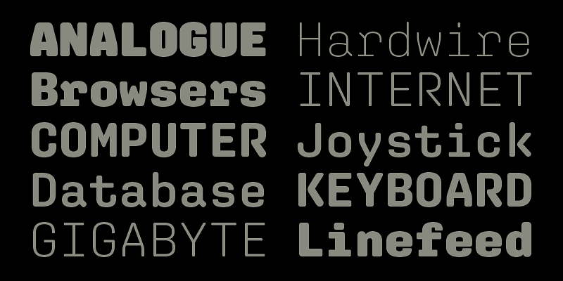 A display face at heart, Aglet Mono also translates well to the more intimate, routine demands of code. Its atmosphere is distinctly industrial and technical, but also unstudied and ad hoc. Aglet Mono is a typeface for people who make stuff, whether headlines or software.