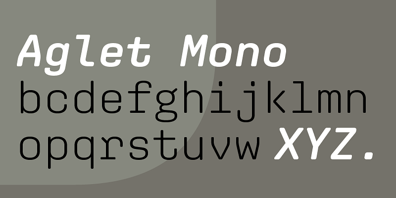 Round architecture informs Aglet Mono, tempering its rigorous, fixed-width rhythm. Clever strategies offset the lopsided spatial artifacts produced by a monospaced design: the dented sides of A, V, W, v, and w compensate for the absence of kerning. Extroverted f, j, r, and t fill their allotted space with curious hooks, and a brazen g supports the calculated weirdness of some of the other glyphs.