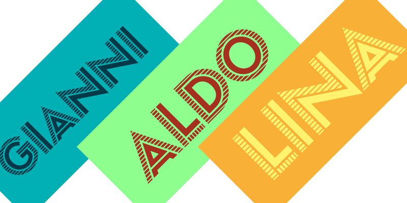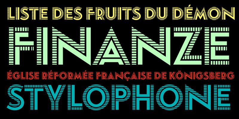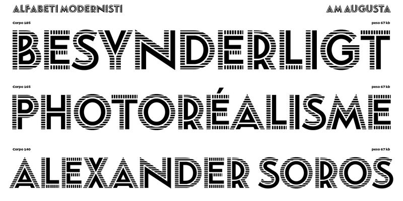 Augusta is an all-caps inline geometric typeface of rather complex construction. Each character has a solid and a shaded side, the latter consisting of a grid of thin parallel lines. It is a prime example of modernist type design, albeit with some letterforms with Art Nouveau traits (see for instance B, F and an alternate round E which can be activated via OpenType features); in fact, Art Nouveau types lasted much longer in Italy than elsewhere and they were still fashionable in the late 1930s.