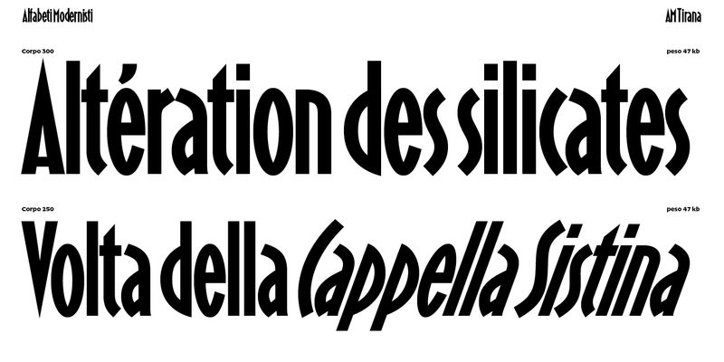 Tirana is a condensed geometric sans with caps and lowercase. It is rich in colour, with a geometric flavour and sharp details. It has a large x-height, low contrast, and very open apertures. Some of the letterforms come from classic modernist lettering, such as the exceedingly open C and S, or the pointed A and N. However, the design is defined by its treatment of spurs and joints, which are either squared or closed at a sharp angle, and its lenticular and lemon-slice counters.