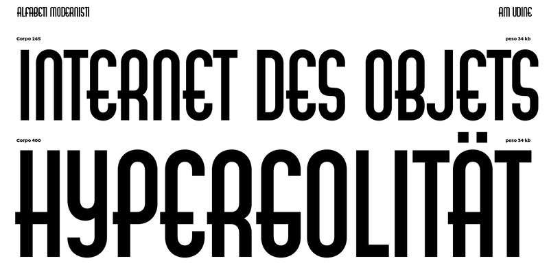 AM Udine digital revival reflects the original with great accuracy. ‘Some details – says the designer Michele Patanè – have been revised for optimal performance in the digital environment. Firstly, the distinctive monolinear strokes of the original model have been fine-tuned by reducing the horizontal strokes by a few units. Secondly, slight adjustments were made to the curves and the transitions between curves and straight lines, and the typeface’s modular appearance was also carefully crafted to avoid the impression of basic geometric shapes glued together. All of this compensates for the unevenness perceived when looking at the letters on screen, while retaining a sense of analog stiffness that is part of the personality of the original typeface.’