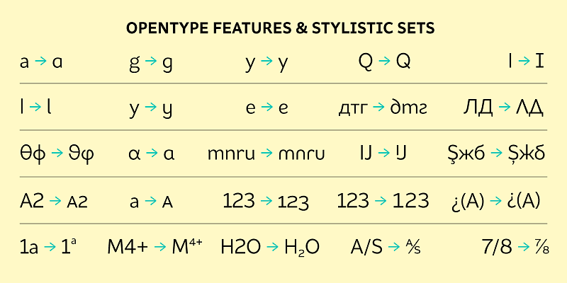 Fonts in the Adobe Fonts library include support for many different languages, OpenType features, and typographic styles.