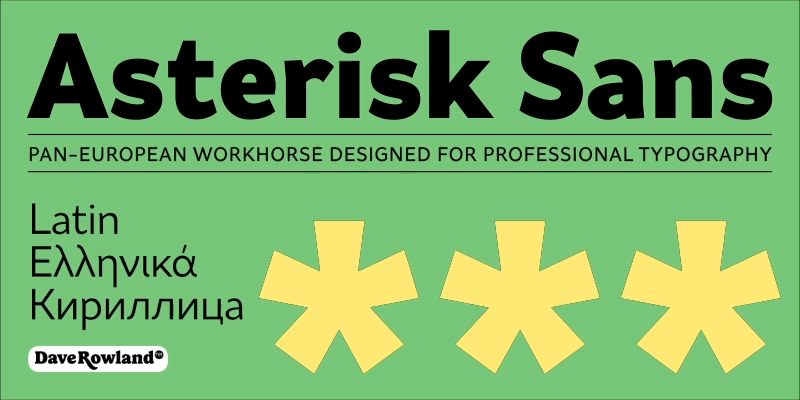 Asterisk Sans Variable aims to be a highly versatile humanist sans. The look is contemporary; details that give the font’s character at large sizes all but disappear when small, making the midrange weights suitable for lots of text. This family is an invaluable tool in your typeface arsenal, great for everything from corporate identities to editorial work, apps, and cookbooks. Asterisk Sans is also massively useful due to its pan-European language support, including Greek and Cyrillic.