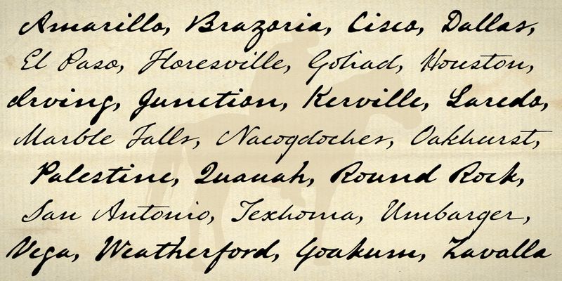 Austin Pen™ replicates the hand of Stephen F. Austin in his famous 1834 Mexican prison diary. Has a regular style and a bold that that seems applied by over-inked pen. Nearly 1,200 glyphs in all.