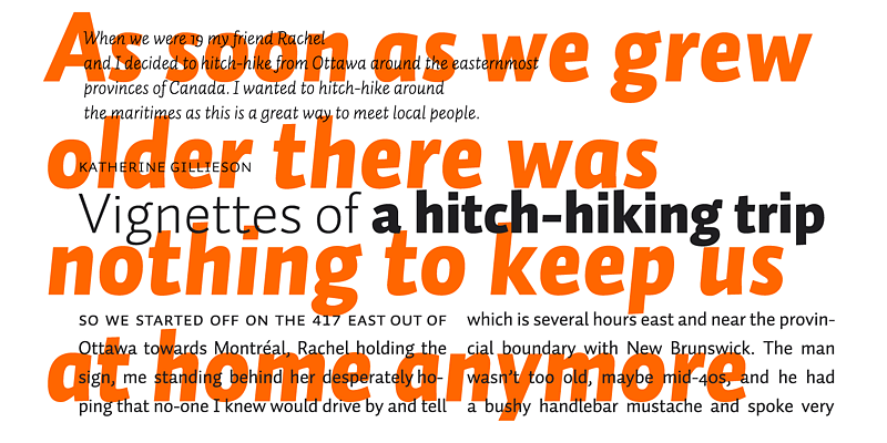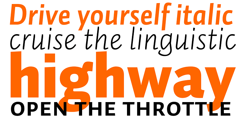 Auto is a friendly sans-serif, suitable for long pieces of text. Auto comes in 4 weights, all equipped with small caps. Most notably: Auto comes with 3 different italics.