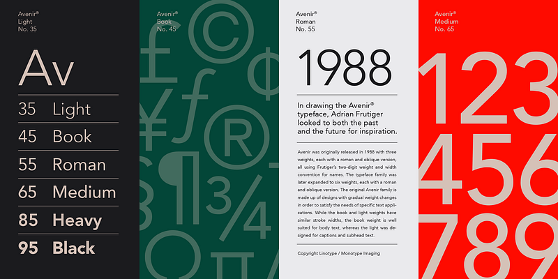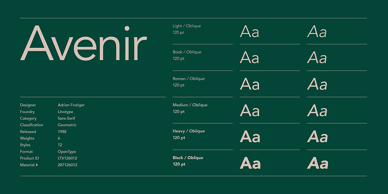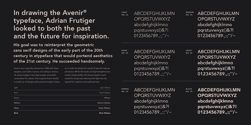 In drawing the Avenir® typeface, Adrian Frutiger looked to both the past and the future for inspiration. His goal was to reinterpret the geometric sans serif designs of the early part of the 20th century in a typeface that would portend aesthetics of the 21st century. He succeeded handsomely. In doing so, Frutiger added a bit of organic humanism to the design, freeing Avenir from the rigid geometric overtones of the earlier designs. Avenir is employed on signage at Dallas Fort Worth and Hong Kong international airports. The city of Amsterdam adopted Avenir as its corporate typeface in 2003. The original Avenir family is made up of designs with gradual weight changes in order to satisfy the needs of specific text applications. While the book and light weights have similar stroke widths, the book weight is well suited for body text, whereas the light was designed for captions and subhead text.