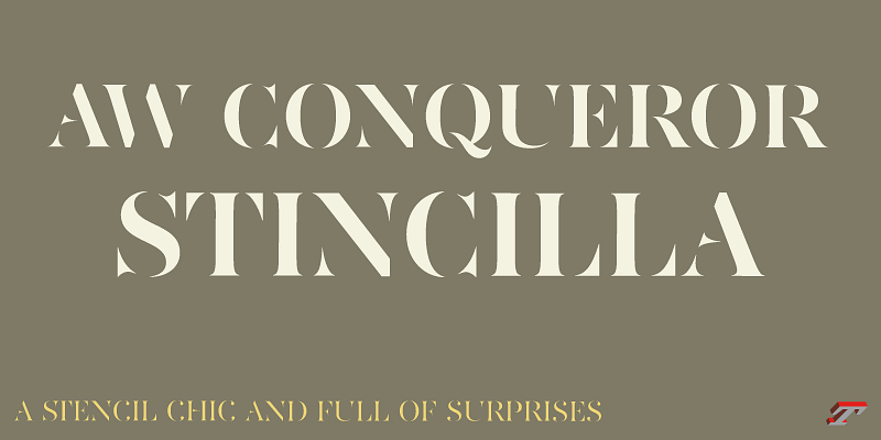 AW Conqueror was designed from the start to create contrasts in your compositions. Chic and full of surprises, Stincilla will work alone or with Inline, Slab, Carved, Sans and Didot. Its 8 styles are compatible with AW Conqueror Didot and AW Conqueror Sans as well Inline, Slab, Carved families.