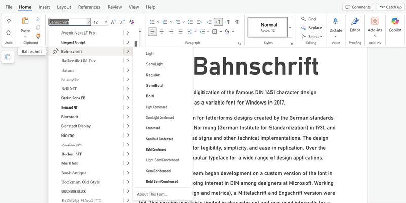 Bahnschrift was Microsoft’s first typeface built using variable font technology, which means that in addition to the typeface’s five pre-built weights and three pre-built widths, it can have potentially infinite variations between the extremes of its weight and width design axes. At any particular width, all the weights take up exactly the same amount of space, so changing the weight doesn’t mean that the text will reflow.