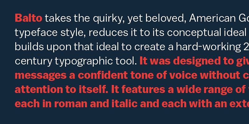 Balto is an American Gothic built for the 21st Century. It has a rhythmic typographic texture that pronounces any message with a confident and approachable tone of voice.