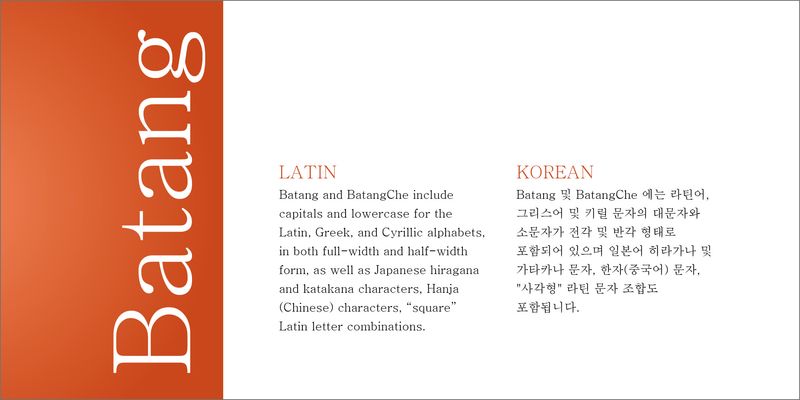 Batang and BatangChe include uppercase and lowercase letters of Latin, Greek, and Cyrillic in full-width and half-width forms, as well as Japanese hiragana and katakana characters, kanji (Chinese) characters, and “square” Latin character combinations.