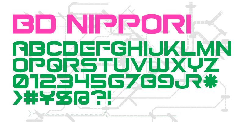 BD Nippori is an uppercase display font inspired by the Yamanote train line in Tokyo. Designed by Lopetz in 2002.