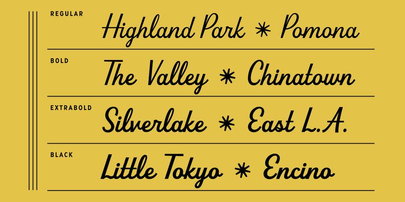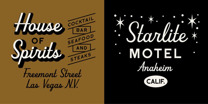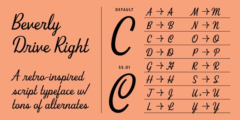 Beverly Drive Right is a retro script font with a low x-height, exaggerated cap height, and 2 unique style sets to suit any occasion. Use the default style set for more casual applications like restaurant menus or beer labels, and the fancier style set 01 for wedding invites or holiday graphics. Includes fun extras like smiley faces, “rd” “th” “st” superscript ligatures, and tons of contextual alternates.