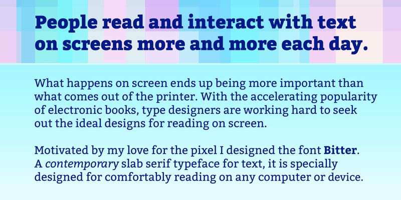 Bitter is available via an open source license. You're free to use it with your Adobe Fonts account just as you would any other font in the Adobe Fonts library. For information regarding other uses of Bitter, see copyright and license details for Bitter Regular, Bitter Italic, Bitter Bold, Bitter Bold Italic, Bitter Black, and Bitter Black Italic.