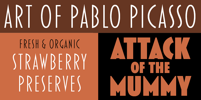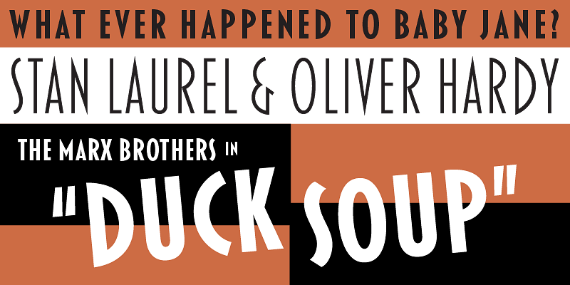 Blakely (2000, 2003) was originally developed as a custom font based on a logo I designed in the early ’90s for the Signals mail order gift catalog. It’s a condensed, sans serif Art Deco design, similar in some ways to Kabel Condensed and Newport, both from around 1930. It’s a caps-only design, and the spacing is optimized for all-caps settings, nearly letter-spaced in the Light weight. I added the Bold and Black weights in 2003, which were in the back of my mind from the beginning.