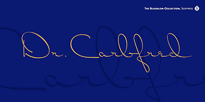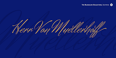 The Charles Bluemlein Script Collection is an intriguing reminder of the heady days of hand lettering and calligraphy in the United States. From the early 1930s through World War II, there were about 200 professional hand letterers working in New York City alone. This occupation saw its demise with the advent of photo lettering, and after digital typography, became virtually extinct. The odd way in which the Bluemlein scripts were assembled and created - by collecting different signatures and then building complete alphabets from them - is a fascinating calligraphic adventure. Because the set of constructed designs looked nothing like the original signatures, fictitious names were assigned to the new script typefaces. The typeface styles were then showcased in Higgins Ink catalogs. Alejandro Paul and Sudtipos bring the Bluemlein scripts back to life in a set of expanded digital versions, reflecting the demands of today’s designer. Extreme care has been taken to render the original scripts authentically, keeping the fictitious names originally assigned to them by Bluemlein.