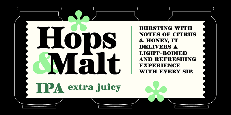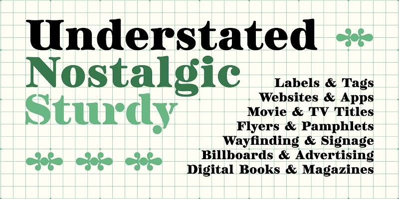 Brag is a squat, bold, soft serif design with a stencil alternative. It is transitional and vintage in a way that feels like it was taken from an old biscuit tin or ephemeral fruit crate label. Understated, friendly, and sturdy without being bland, cloying, or stuffy. Brag is eager to be used on all-natural food packaging, gardening equipment displays, collectible books of poetry, and microbrewery branding. Pairs well with others but can stand on its own; give Brag a try!