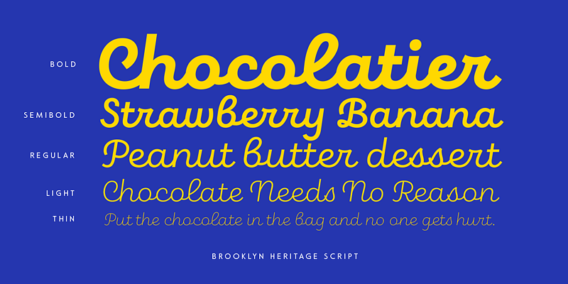Brooklyn Heritage Script is the joyous result of what happens when a grotesque typeface design wakes up and decides to become a playful, swashy script instead. With 500+ glyphs included, it supports most Western European languages and is full of stylistic alternates that make the script even prettier. Brooklyn Heritage Script is an exciting find for a designer looking for a great companion to evolve a customer’s branding, collateral, website, book series, social media, mobile app, or magazine.