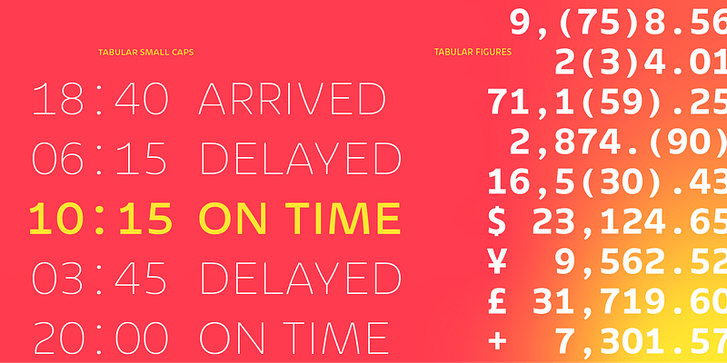We developed a 18 font family with almost 900 different glyphs such as small caps, superiors, inferiors, fractions, tabular, old-style and lining figures, mathematical, numbers, etc. Allows you to compose editorial complexity.