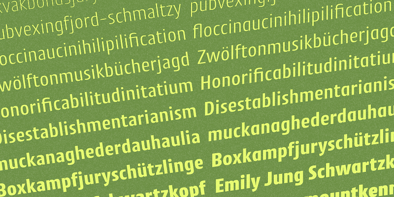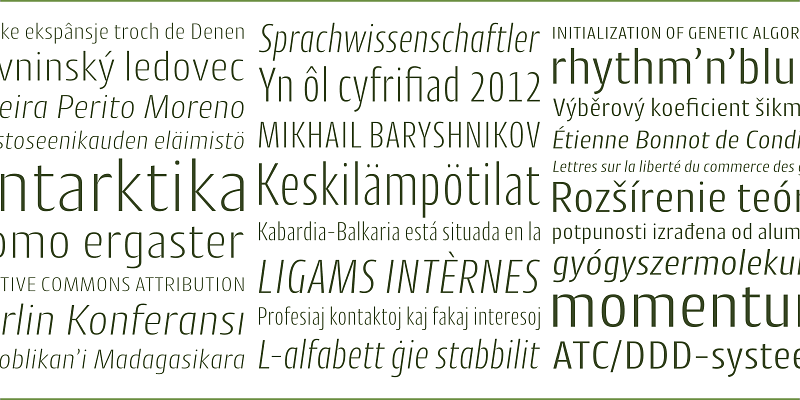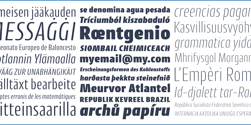 Cantiga is a workhorse sans, with 18 styles for both the regular and condensed versions. The thinnest and heaviest weights are made for titles, while the mid-range weights work nicely as text faces.