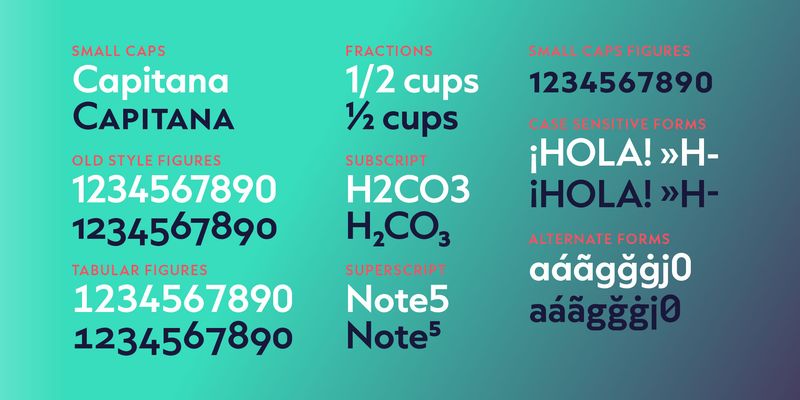 Capitana is an ultimate allrounder: with nine weights from Thin to Black, it offers both light and extremely heavy weights for striking headlines. Its open forms make it particularly legible in small sizes, and it also offers several styles for running text. Capitana has a powerful opentype engine with small caps plus corresponding figures, tabular and oldstyle figures, arrows, alternate letters for g and a, as well as fractions, subscript and superscript, However, with its minimalist design and low contrast, it is best suited for on-screen use – meaning web design, user interface design (UI&UX), and app design.