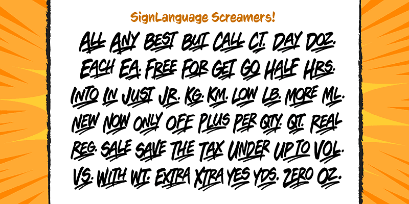 Inspired by the paint brush lettering at our local grocery store, Sign Language is a font that can put lettuce on sale, pull you up by your bootstraps, and make the impossible possible!