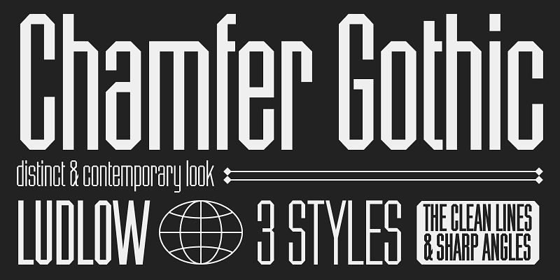 Chamfer Gothic is a condensed display typeface with sharp verticals, tight spacing, and distinctive chamfered terminals. Its tall, narrow proportions and squared-off forms give it a striking industrial character with palpable tension. Chamfer Gothic commands attention! Bring a little edge and purpose-built precision to your bold typographic compositions, including headlines, posters, magazines, book covers, and packaging where space is limited and impact is everything.
