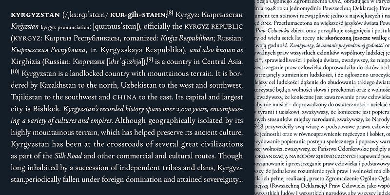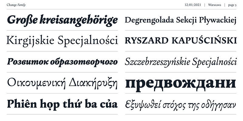 Change is a typeface family designed as a part of Mateusz Machalski’s PhD project, carried out in 2015-2021. The main goal was to create a typeface allowing for the typesetting of complex humanistic texts, containing many historical letterforms. The starting point was the preparation of most of the glyphs provided in unicode for Latin, Cyrillic and Greek. From the formal point of view, the Change family is based on Renaissance proportions with contemporary details. Classic upright version is paired with expressive and calligraphic italics, inspired by the works of Robert Granjon.