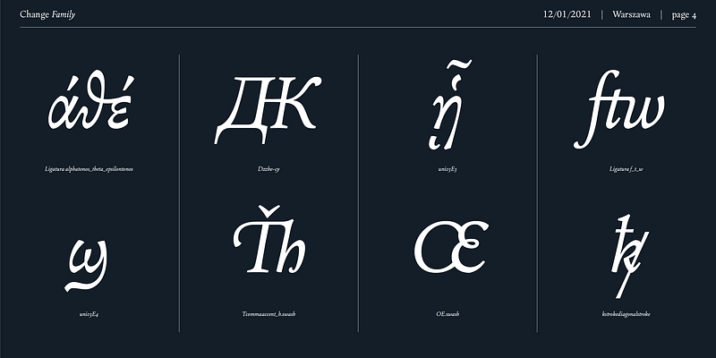 Each of the styles contains about 4,000 characters, allowing for a broad range of typesetting capabilities – multiscript publications, historical translations, and texts transcription. The crucial aspect was to treat all scripts equally. All OpenType features, such as swashes, final forms, decorative ligatures, can be found in Latin, Cyrillic and also Greek. The name of the typeface refers to the design process in which there are constant changes and corrections. On the other hand, it means to convey how this project influenced my perception of typography and allowed me to embrace it as a medium of artistic expression. Due to its similar proportions, Change works perfectly with the Gaultier typeface .