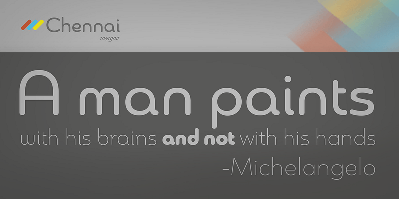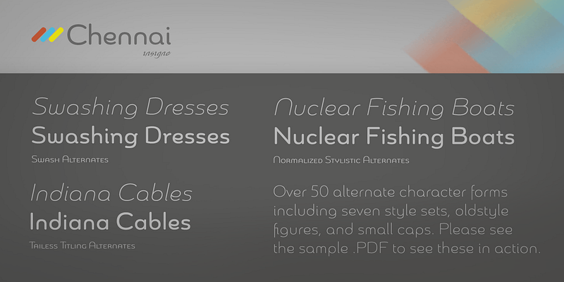Chennai is a simplified sans-serif with a full complement of OpenType alternates. The typeface is rounded, slightly extended and geometric.