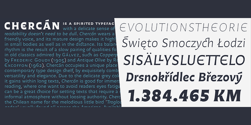 Chercán is an elegant, highly readable, relaxed typeface, making it a good choice for informal settings. Chercán was conceived for immersive reading, with strong, open letterforms and generous counter shapes. It communicates certitude with a subtly charming tone. Its tiny serifs help build an enjoyable reading experience, certainly when compared to that of a sans serif. Chercán has a positive personality, and its whims can add spiciness to headings, logos, packaging, and big bodies in general. In 2021, a complete polytonic Greek version was added to the original Latin extended.