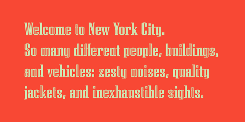 In the condensed styles of most geometric slab serifs, weak ovals replace the powerful circular forms. In Citadel, Tobias Frere-Jones follows a stronger alternative, substituting straight strokes for the curved sides of round characters. Flat horizontal curves play against the variety of serifs, in counterpoint to the repeating rhythm of verticals. In the Inline style, the stripe adds to that rhythm, creating a typeface that offers a powerful and stylish geometry.