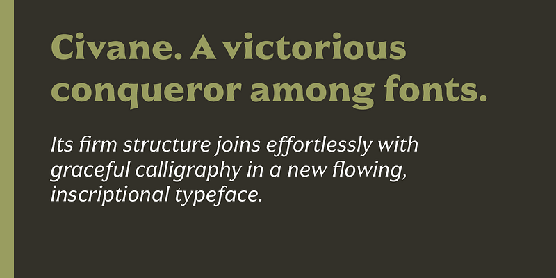 Civane’s firm structure joins effortlessly with graceful calligraphy in a new flowing, inscriptional typeface.