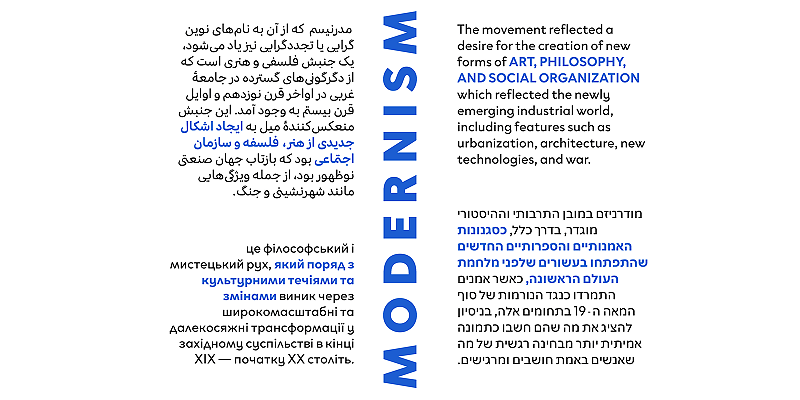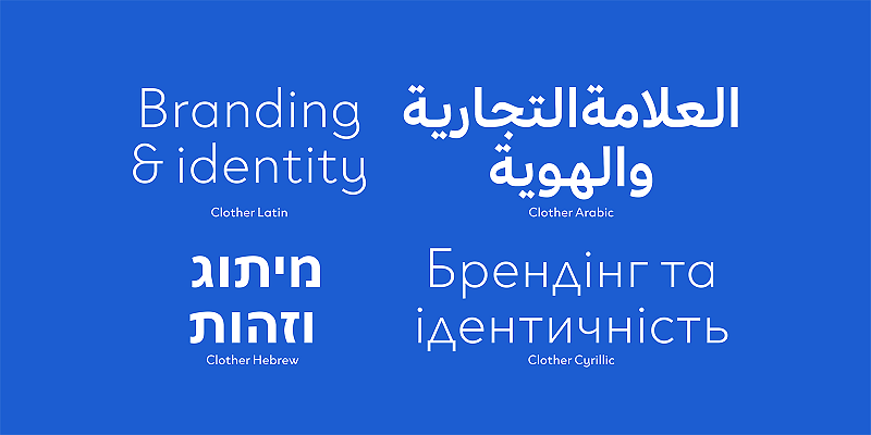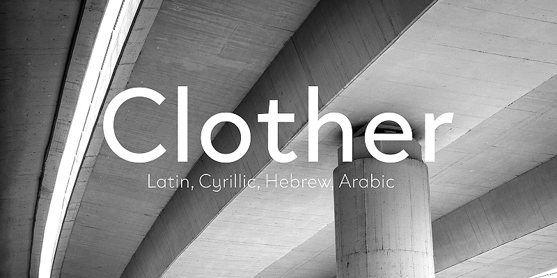 Clother is a geometric sans serif family supporting Arabic, Cyrillic, Hebrew, and Latin, designed to deliver a consistent visual identity for branding, corporate design, and communication. Thanks to details that distinguish it from similar typefaces, this cohesive graphic vocabulary enables businesses to reach global markets seamlessly. The low-contrast, almost monolinear lettershapes keep text clean and professional with a modern personality, well-suited for reports, presentations, and internal communication.