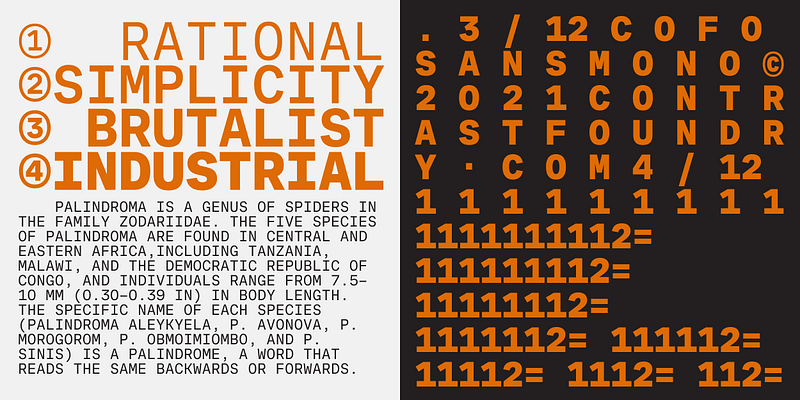CoFo Sans Mono is the new member of our CoFo Sans Family. It comes in 4 weights—Regular to Black,—which all share the same width. CoFo Sans Mono retains many of the key characteristics of CoFo Sans, but they’ve all been adapted to fit the demands of a monospaced typeface. You will notice a significant difference in the proportions, sometimes even in the construction of certain letters. Special attention was given to the Cyrillic letterforms, which are a particular challenge in a monospaced width, due to the large amount of wide characters, but we are particularly proud of the balance we managed to achieve in Cyrillic, even in the heavier weights. CoFo Sans was designed with simplicity in mind and the monospaced version with its rationality, clean forms, industrial feel and a rich character set that includes Latin, Cyrillic, an extensive set of figures and carefully crafted fractions and symbols is no different. CoFo Sans Mono can be used on its own, but it’s also a great addition to CoFo Sans, which is slowly growing into a big family with a diverse set of possible uses. Combined with the full family, CoFo Sans Mono can become a powerful system for complex typesetting.