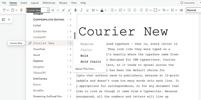 Courier New is a monospaced typeface – that is, every letter is exactly the same width. They look like they were typed on a typewriter, because that’s exactly where the typeface came from: the original Courier was designed for IBM typewriters. Courier New has fairly wide letters, so it tends to sprawl across the page. For many years, it has been the default choice for manuscripts that authors send to publishers, because at 12-point it’s readable and doesn’t cram too many words onto each line. It is very appropriate for correspondence, or for any document that you’d like to look as though it came from a typewriter. Because it is monospaced, all the numbers and letters will line up vertically.