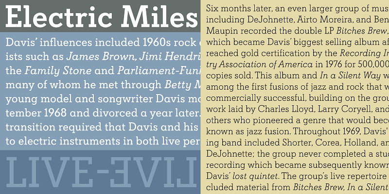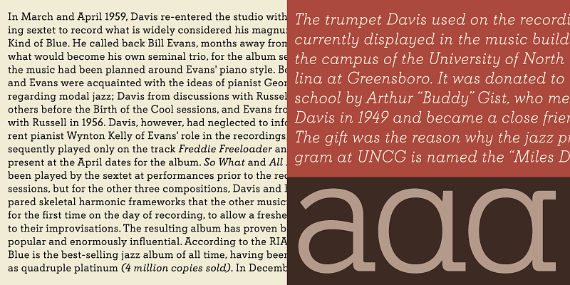 Davis and its sans serif counterpart, Davis Sans, work very well together to satisfy the multiple layers of corporate, advertising and interface applications, from identity and editorial to the many levels of product branding.